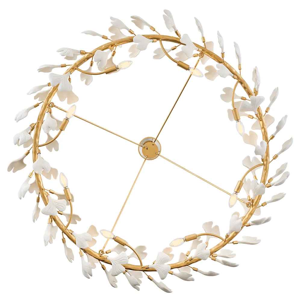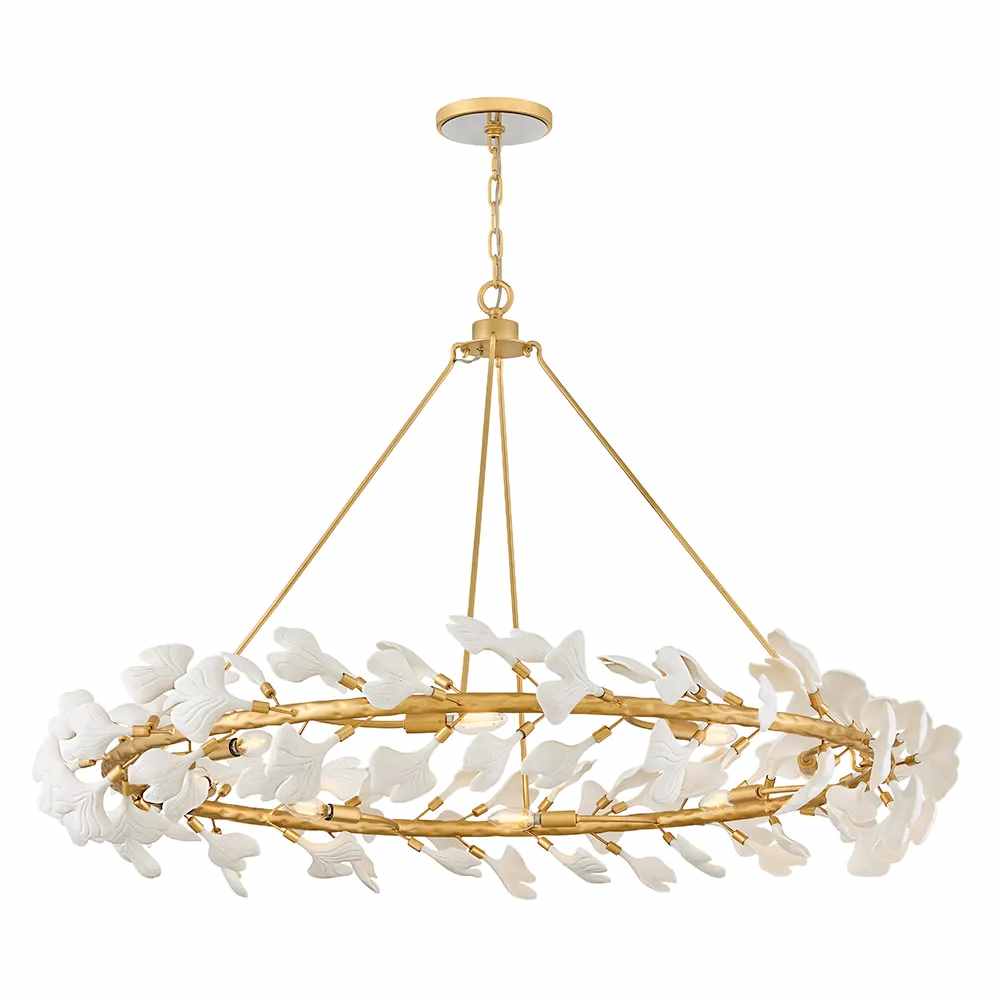 Adorned with delicate ceramic ginkgo leaves at the end of elegant hand-forged branches, Audra’s enchanting frame features a gorgeous, hammered texture finished in Deluxe Gold. Exposed LED candelabra lamps cast a magnificent warm glow.